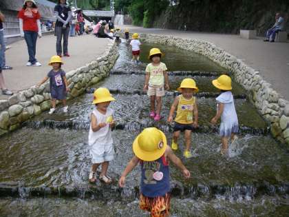水の掛け合いっこをしたり,だんだん川にお尻をつけて座ったり,プールとは違うけれど水に十分親しみ遊ぶことができました。お家の人や先生や友達という身近な人と一緒だからいろいろ試して楽しむことができたのでしょうね。