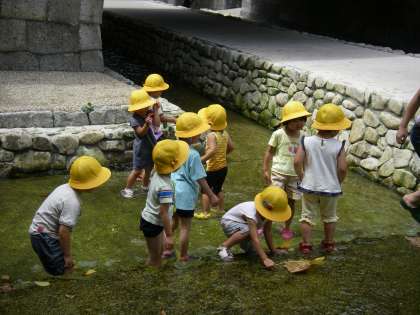 始めのうちは川を歩いたり,飛び石を渡ったり,川の階段をジャンプしながら降りていったり,流れてくる葉っぱを集めたりしていました。川の水は冷たすぎず,気持ちよかったので子どもたちはだんだん大胆になってきました。子どもたちでも姿勢を低くしないと通れないような橋の下を通ったり,黄帽子を川上から流してその橋の下を流れていくのを楽しんだり,またその黄色帽子を順番に拾うことを楽しんでいる子どももいました。