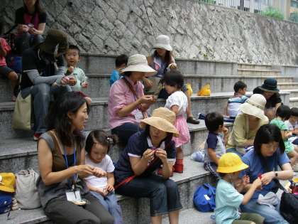 元誓願寺を超えて,今度は川沿いの道へと入っていきました。川沿いの道は,車が来ないので安心です。子どもたちは,お家の人とギュッと手を握りしめて嬉しそうに歩いていました。いつもは兄弟姉妹がいて,なかなかお母さんやお父さんと二人っきりでいることの少ない子どもたちが多いと思います。今日はお母さんやお父さんを一人占めできてとても嬉しそうに感じました。