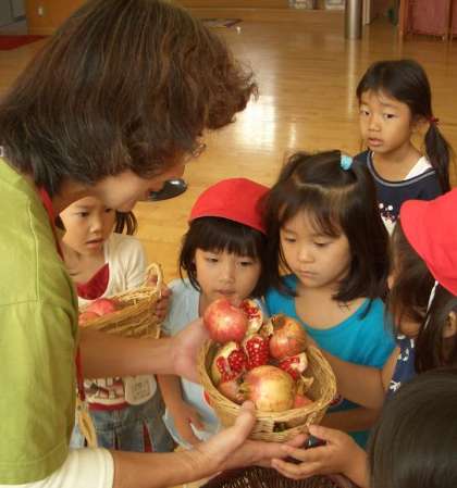 しばらくするとざくろを全部かごに入れて,子どもたちが園長先生を訪ねてきました。