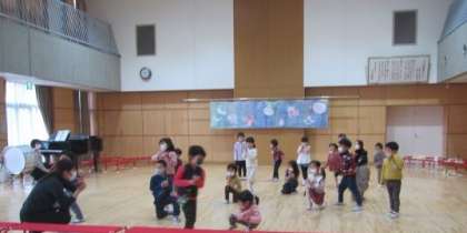 4歳児のふじ組では,楽器遊び(写真上)のほか,手話と身振りをあわせた「しあわせならてをたたこう」をやってみました。歌にこめられた思いがいろいろな人に伝わるといいなと思っています。