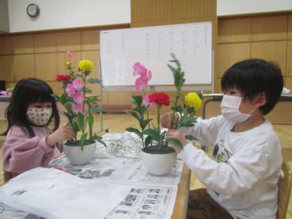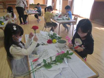 初めての体験に「どうしたものか」と迷うのかな?と思っていましたが,意外にも思い切りよく花にハサミをいれ,楽しそうに花を生けていました。
