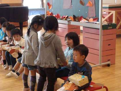 「この前,御苑に行ってどんぐりを見つけたね。今日はどんぐりさんがお友達を紹介してくれますよ」ということで誕生会が始まりました。