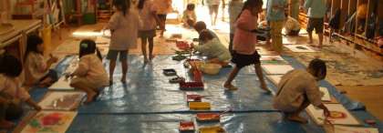 隣の5歳児のゆり組の部屋を覗くと,そこでも絵の具遊びをしてました。