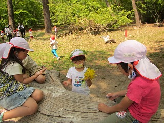 春の心地よい気候の中,年中児と年長児で久しぶりの園外保育へでかけました。京都御苑は春の草花でいっぱいでした。お日様はあたたかく,そっと吹く春風がとっても気持ちよかったです。春の草花探したり,かくれんぼをしたり,バッタの赤ちゃん?やかたつむりを発見したり・・・久しぶりの遠足を楽しんだ子ども達でした。