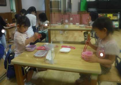 いっぱい遊んでお弁当の時間になると,早くお弁当を開けたくて仕方がない子や,「先生見てみて!」とお弁当の中身を嬉しそうに見せてくれる子,「お母さんの作ってくれたお弁当美味しい!」ととっても美味しそうに食べている子など,いつもとは違うごはんにみんな大満足な様子でした。