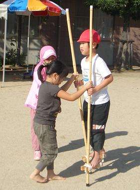 そんな友達を応援して竹馬を持ってあげる友達,