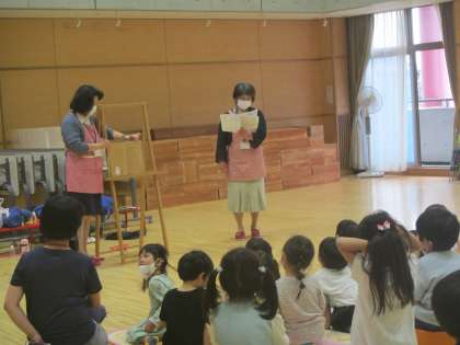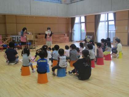預かり保育に参加している3学年の子どもたちは,毎日の各クラスでの『読み聞かせ』とは違う雰囲気を感じ,とても集中してお話に目と耳を向けていました。