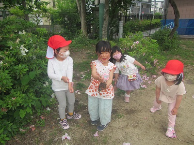 昨年植えた『えんどう豆』『そら豆』が日に日に大きくなる様子を,わくわくしながら「観察」したり,色々な草の根っこを抜いてみて,抜くときの感触や予想以上の大きさにびっくりしたり・・心を大きく揺らしています。そして,このような遊びの中では・・・『科学』する心の芽生えも感じますね。