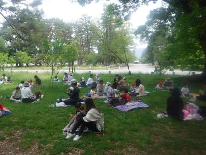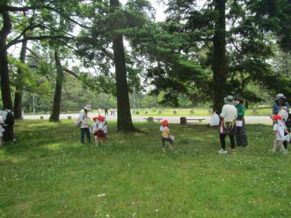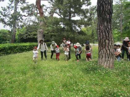 5月19日・・・夏を思わせる日差しのもと,3年ぶりの『おやこえんそく』にでかけました。子どもたちは教職員やおうちの方と一緒に,御苑の豊かな緑のなかで『ネイチャービンゴ』や『ウォークラリー』をしたり,ふれあい遊びをしたり・・・とても楽しい一日を過ごしました。