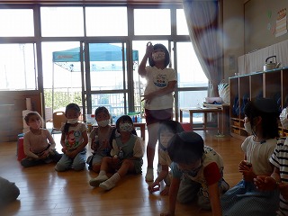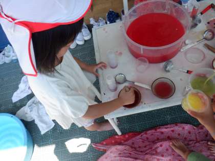 赤・青・黄の色水をだして遊びました。自分のつくった色を見ながら「曇った日の空の色!」「優しい水色」「紫よりちょっときたない色」など,色の明度や彩度を感じ,自分なりの言葉で表現していました。子ども達の感性って素敵ですね。最後には,自分のつくったお気に入りの色をみんなの前で発表しました。
