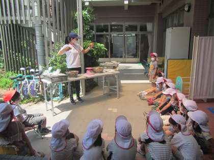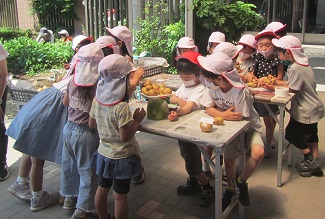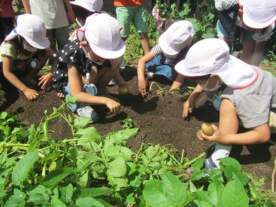 5歳児は,昨年度園庭に植え付けた『ジャガイモ』を収穫しました!みんな「いっぱい掘るぞ〜!」と意欲満々でした。自分の『手』で硬い土もどんどん掘り進んでいきます。そしてゴロゴロ出てくるジャガイモを友達と一緒に集めたり,重さをはかったり,『こっちは男爵かな?』『これがメークインかな』と種類の違いに気づいたり・・・心を十分に動かして活動していました。そして最後は,このお芋たちをどうして食べるのか?を友達や先生と熱心に話し合っていました。