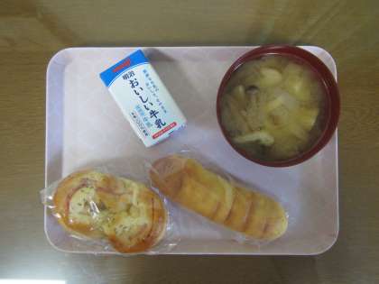 今日のみつばランチは・・・・4・5歳児が昨年度から大切に育て,今年,収穫したジャガイモと玉ねぎを中心とした,具沢山「お味噌汁」+地域のお店のおいしいパン+牛乳というメニューでした。