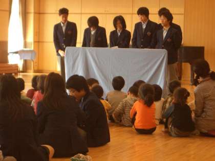 遊戯室で人形劇を見せてもらい,その後は園庭に出て遊びました。