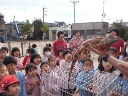 さて,おじさんが手にのせているのは何でしょうか?「い」のつくものということでした。しばらく考えていましたが,「イグアナかなぁ?」という人がいました。そう,正解はイグアナでした。じ〜っと興味深くみていましたが・・でも触るのはちょっと・・。
