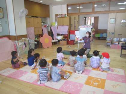 6月のお誕生会を行いました。3歳児は自分たちの保育室で・・4・5歳児は広い遊戯室に集まって…行いました。