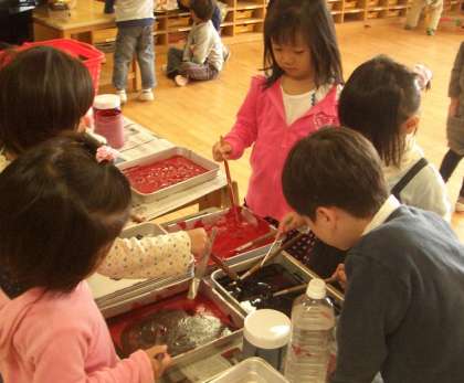 自分たちで絵の具をといたり,シートを広げたりして,準備のお手伝いも上手になりました。