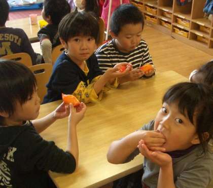 でも,切った柿をみた子どもたちは,少しひきぎみです。