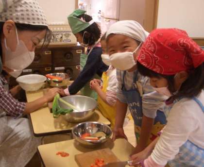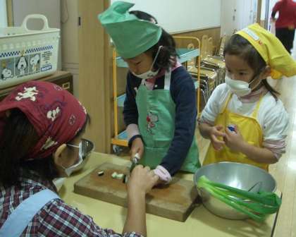 本物の包丁を使っての調理なので,食育・農園班のお母さんにもお手伝いいただき,安全に楽しく取組むことができました。