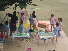 7月のある日・・・園庭の心地よい木陰で5歳児の『えのぐ遊び』が始まりました。