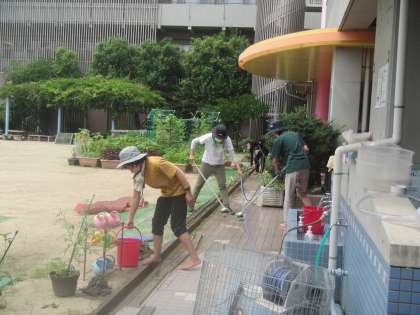 きょうは外回り。子どもたちが,いろいろな遊びを楽しんだテラスをチームワークよく,きれいにお掃除していきました!