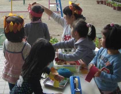 すてきな冠に魅せられて,3歳児の子どもも覗いていると,ばら組のお姉さんがつくってあげていました。