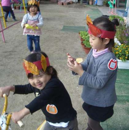 しばらくするときれいな冠をかぶったばら組の子どもたちが園庭で遊んでいました。