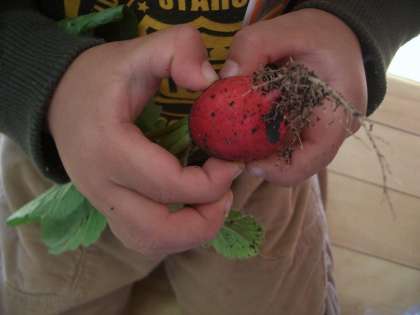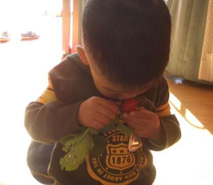 土の中には,大きな二十日大根が真っ赤になって隠れていました。