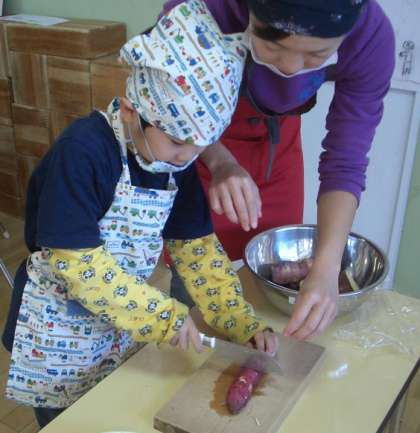 まずは,包丁でサツマイモを切ります。