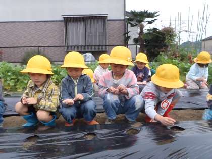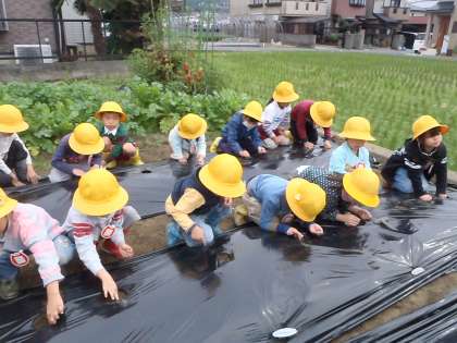 お母さん先生にマルチをはってもらっている間に,畑探検です。たくさんの野菜の様子をみていると,ナスをとってもいいといってもらい,喜んで収穫する子どもたちでした。