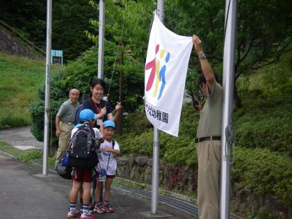 約1時間バスに乗って,花背山の家に到着しました。到着してまず,入所式です。花背山の家の先生にお話を聞いたり,みつば幼稚園の旗を揚げたりして,2日間楽しい時間を過ごすことを楽しみにスタートしました。