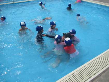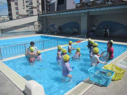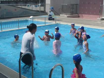 3歳児は『水と仲良し!』先生大好き!・・・4歳児は『友達と一緒!』いろんなことをやってみよう!・・・5歳児は『挑戦!』思いきり体を動かして!・・・という姿がさまざまな場面で見られました。