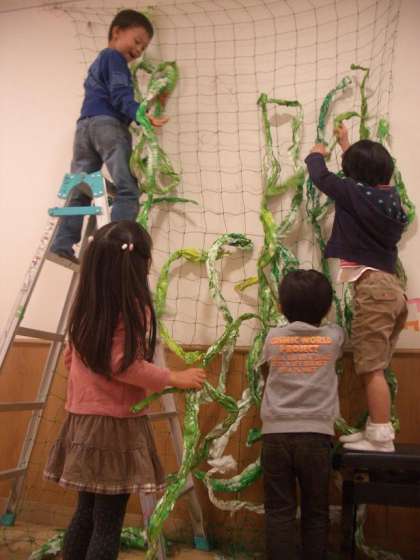そこでつくった「つる」をネットにはわしたいと,廊下に畑ができました。