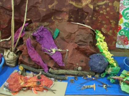 4歳児のばら組も,先週自然物を使ってつくっていた虫やザリガニたちを廊下の畑に飾りました。