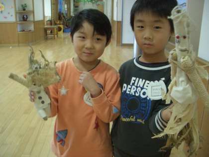 ポップコーンの芯と芯をボンドでとめてもなかなかひっつかないので,紐で補強するなど,これまで遊んできた経験が生きています。