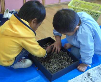 好きな葉っぱをひっつけたり,棒をぽきぽき折ってつけたり,思い思いに楽しんでいました。