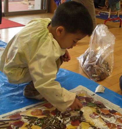 これまでみんなで一緒に遊びに行った京都御苑やアクトパル宇治で集めたり,先生がみんながもっと遊べたらいいなと思って集めてきた葉っぱや木の実,枝などを使って,大きな紙の上にボンドでひっつけて遊んでいました。
