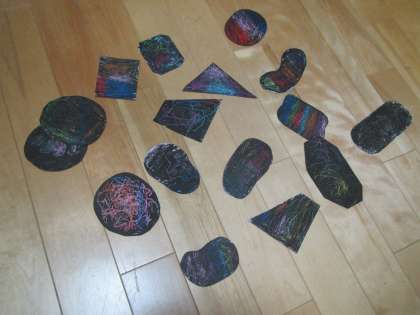 この日は4歳児が『スクラッチ』を楽しみました。子どもたちの集中力がMAX!で保てるように,小さ目の紙を準備!小さな画面に,クラス全体がし〜んとするほどに集中して,力強くパスを塗り込んで行っていました。その上に黒を塗って・・・竹串でひっかくと・・・そこからあらわれる『色』の美しさに子どもたちも『びっくり!』している様子でした・