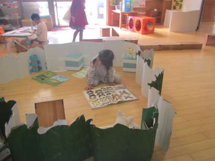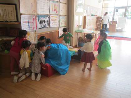 4歳児は,4月から『虫たち』に興味をもって遊んでいます。その中で,自分たちが『虫』になりきって遊ぶことが大好きです。「カマキリが来たよ〜」とちょうちょさんたちが急いで隠れたり・・・『昆虫太極拳♪』の体操で体を鍛えたり・・・『虫のおうち』の中で,自分たち『ちょうちょ』のことを“勉強”したり・・・と子どもたちのイメージの世界がどんどん広がっていきます。また友達や先生と,互いに自分の思いを伝え合ったりして遊ぶことも楽しんでいます。