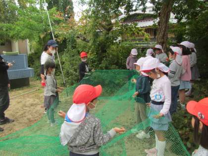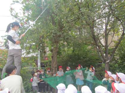 どうして取ったらいいかを,ずいぶん前から友達や先生と『相談』していた年長児たち。大きなネットをしてに広げて,みんなでキャッチする方法にしました。