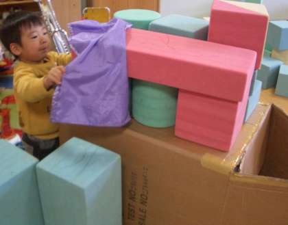 大きな段ボール箱の上や中に積木をいっぱい乗せたり入れたりしています。