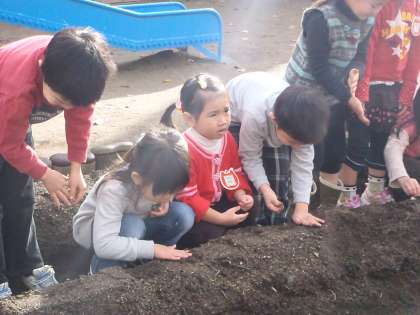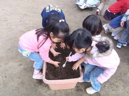 もう一つお楽しみはソラマメです。ソラマメはエンドウマメと違ってとても大きな種マメです。プランターの土作りから始めましたが,土と腐葉土を手で上手に混ぜていたのですが「パワーの素も入れんとあかん」と保育室の前から入れ物を取ってきて入れ始めました。「これくらいかな」といいながら入れては混ぜ,また入れては混ぜを繰り返してだんだんフワフワの土のお布団が出来上がりました。