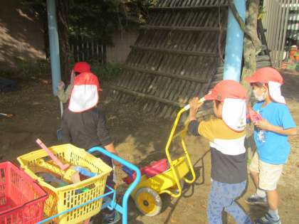 秋も深まり,肌寒さを感じる季節となりましたが,子どもたちは・・・やはり砂+水が大好き!この日は朝に,先生が少し砂場全体を掘り返して,ふかふかの砂にしていたこともあり,学年を超えた『グループ』で『大規模な!川つくり』が始まりました。
