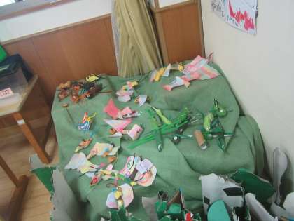 子どもたちは,特に虫たちが大好きで,いろいろな遊びへとつながっています。11月になって『本当の虫たち』の姿はめっきり少なくなってきました。そこで,この頃4歳児は・・・先生と一緒に様々な素材を用意して,紙を丸めたり…布を染めたりして・・とってもユニークな虫たちを作り始めています。「みんな違ってみんないい!」自分の思いで,自分の手で作り上げた作品は本当にいとおしいですね!