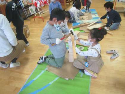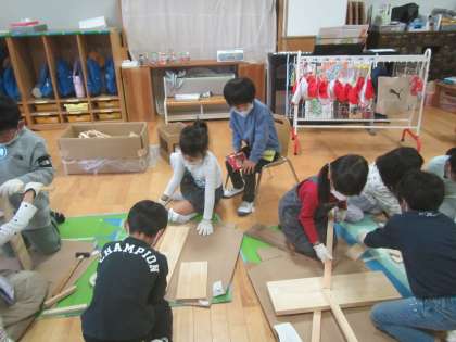 11月に入り・・年長児たちは様々な遊びへの『向かい方』がとても深まってきたなぁ〜と感じます。そして今は『トンカチ!』・・木工遊びに夢中になっています。保護者の方のご厚意で地域の方からとても『いいにおい』のするヒノキなどの木片をお譲りいただきました。様々な形や手触りの素材を前にして,子どもたちのインスピレーションは豊かに広がっていきます。またその中では,友達との協力…話合い…失敗…成功!など様々な体験が深まっています。