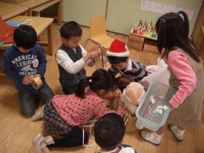 5歳児のゆり組の保育室にサンタクロースの人形がかざってあります。