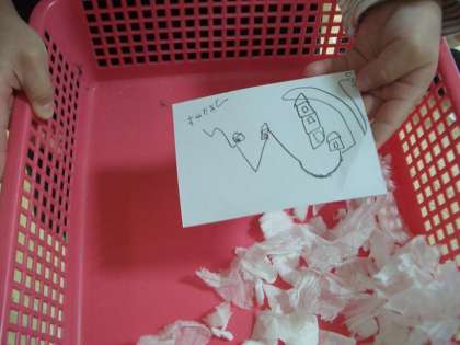 と包装紙でお部屋のおもちゃをきれいに包み,袋に詰めていきます。