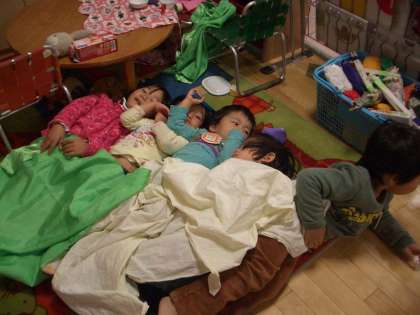 3歳児の子どもたちも,それは大変!と大急ぎでおままごとコーナーで寝ています。