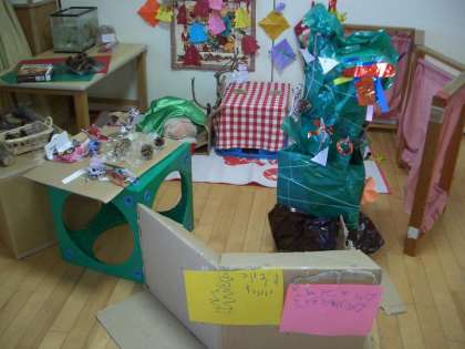 4歳児の保育室では,サンタさんのお家もできてきました。