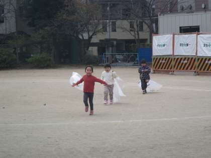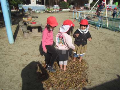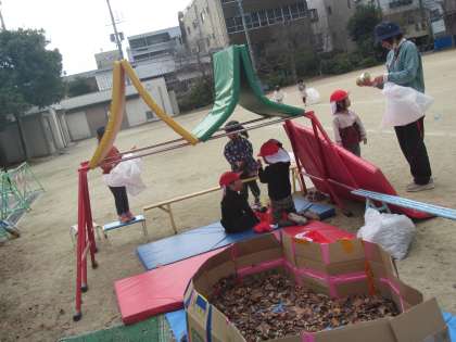 園庭で・・・マットや鉄棒で『秘密基地』を作ったり・・・大きな袋に『かぜ』をいっぱい入れて『たこ?上げ』をしたり・・・落ち葉を集めて『♪カサカサ・しゃらしゃら』と音や『におい』を感じたり・・・子どもたちの心も体も大きく動いているようです。